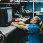 Man repairing an old television with static in a cluttered workshop setting.